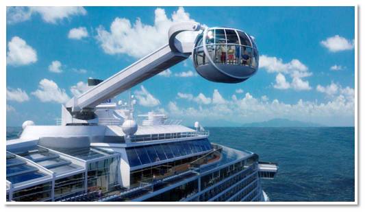 大名鼎鼎的北极星,是船上的海拔最高点。其设计受到了英国伦敦眼的启发,是工程学上的一个奇迹,可360度旋转的吊杆手臂,将宝石形的玻璃舱将游客送往离海平面91米的全新高度,让游客将海景、目的地和船体尽收眼底。