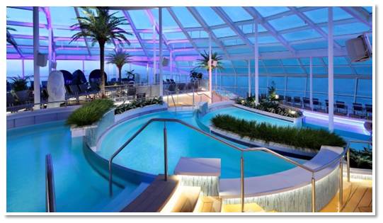 阳光府邸位居船艏,玻璃穹顶之下,棕榈掩映池水之间,游客可在品茶之余海阔天空,凭窗远眺水天一色。首创阶梯式泻湖泳池设计配合全玻璃顶棚,让客人体验舒适恒温空间、夜晚独享熠熠星光;并配置了带伸缩天顶的冷水池、温水按摩池等多功能泳池体验。