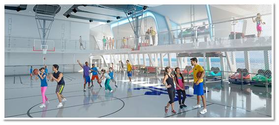 横跨两层的室内运动馆,是海上的大型室内运动空间,提供海上碰碰车、篮球场、海上Xbox360、滚轴溜冰、乒乓球、桌上冰球等娱乐设备,重温儿时流行的游戏,和从未玩过的项目。