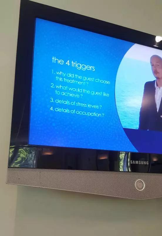 我们的SPA每个航程都要做“女士宠爱派对”,及给客人普及面部皮肤保养与护理知识,教授和免费给客人提供自家产品使用。还会有免费的眼部体验,配合“眼部护理”讲座共同进行。另外包括“海藻芳香排毒”讲座。预定各项理疗服务时尽量不要和讲座时间重合,(各项讲座时间在航程开始前会预定好时间在你的工作流程表里,注意查看就行)
